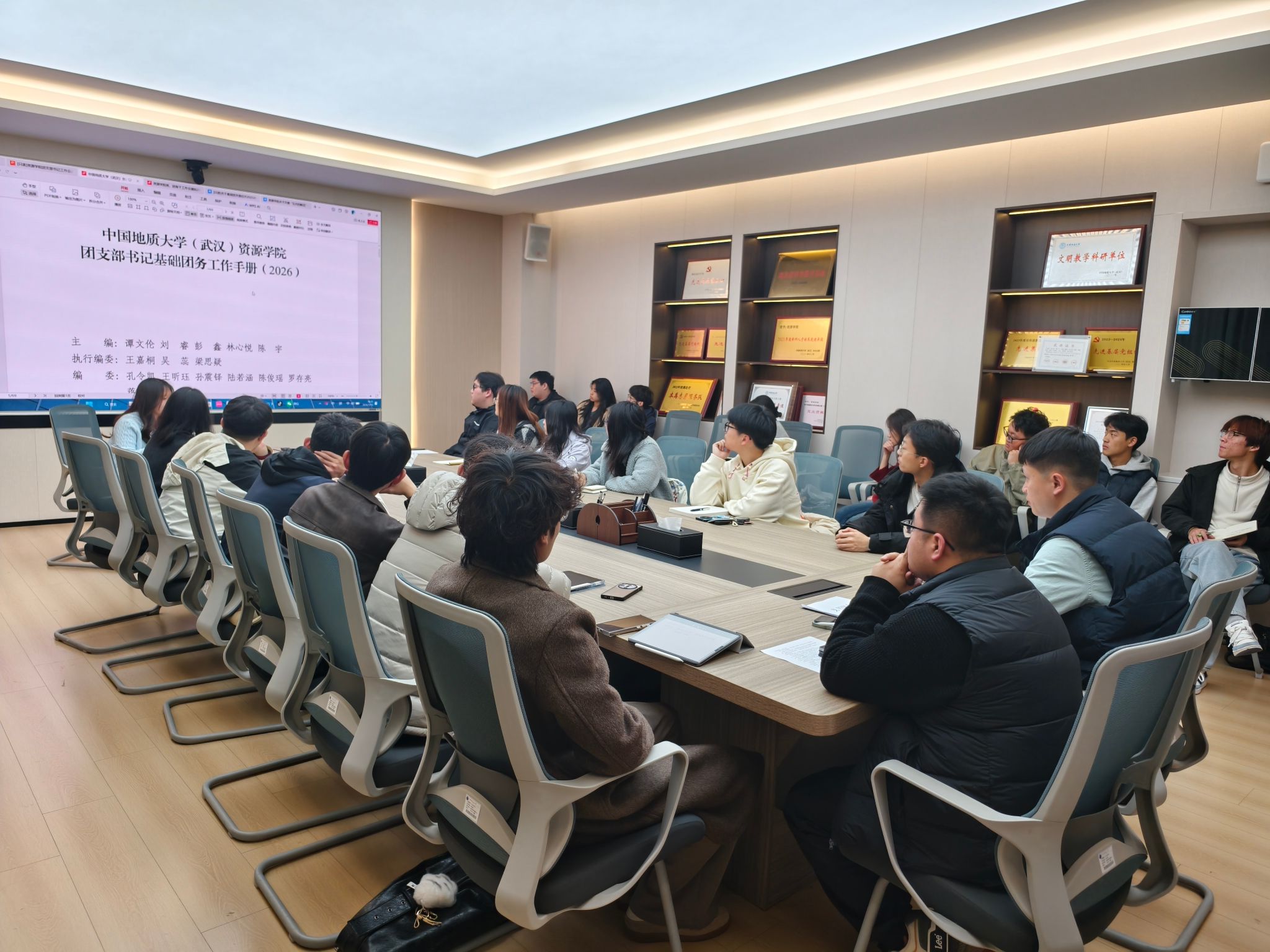 为进一步强化基层团组织建设,增强基础团务工作规范性,提升团支部书记履职能力,学院团委组织部部长吴蕊重点解读了《中国地质大学(武汉)资源学院团支部书记基础团务工作手册(2026)》(以下简称“《手册》”)。她讲解了《手册》内容的“团的基本知识、基础团务工作、团支部书记要知晓的特色团学活动、资源学院特色主题团日活动”等四个章节的内容,并号召全体团支部书记增强政治意识,强化工作基本规范,带领团员青年共同夯实支部基本建设。
