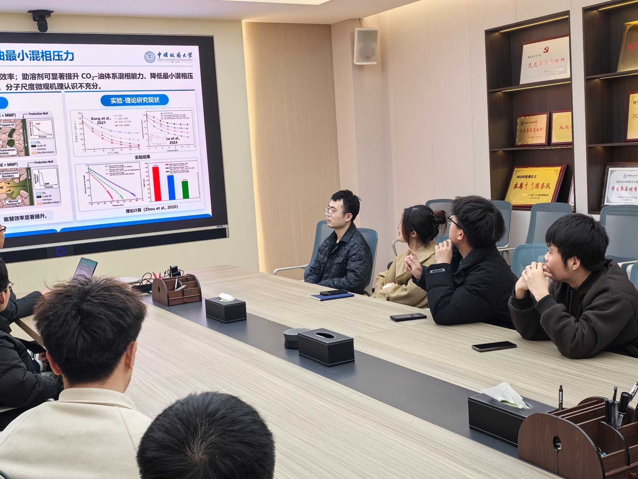 谢忱悦以CO₂提高页岩油采收率的核心参数——最小混相压力为切入点,结合页岩储层纳米孔隙发育特征,系统阐释了纳米限域条件下流体与孔壁相互作用对CO₂-原油体系混相行为的影响,清晰解读了纳米孔环境下最小混相压力低于体相条件的独特规律,同时围绕分子动力学模拟这一核心研究方法,详细介绍了典型页岩矿物纳米孔隙中CO₂–原油体系的研究成果,从分子尺度揭示了混相行为的微观作用机制,为在场学子开展油气储层开发相关研究提供了重要思路与实践参考。