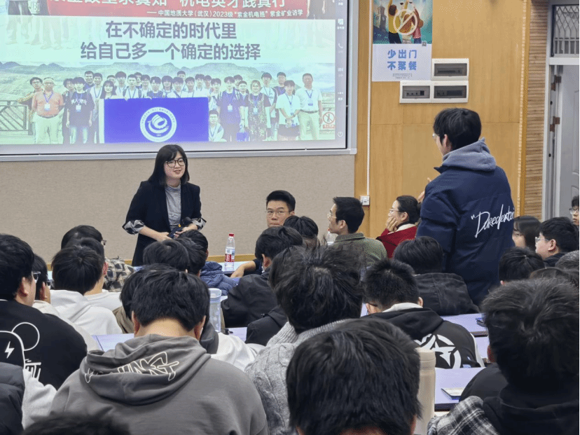 为了让同学们更直观地了解“紫金机电班”的培养成效,吴迪分享了第一期“紫金机电班”学员的成长案例和学习感悟,通过生动的实例展现了校企联合培养模式在提升学生专业能力、实践能力和职业素养方面的显著成效,进一步激发了同学们的参与热情。