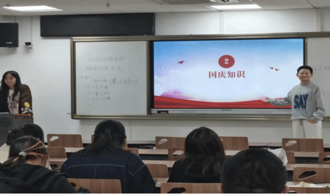 随后,朱冬梅同学聚焦“国庆知识”,通过生动的案例与详实的数据,为大家讲述了国庆节的由来、国旗国徽的设计寓意,以及历年国庆盛典中展现的国家实力与民族精神,让团员们在了解国庆知识的同时,增强了对祖国的认同感与自豪感。
