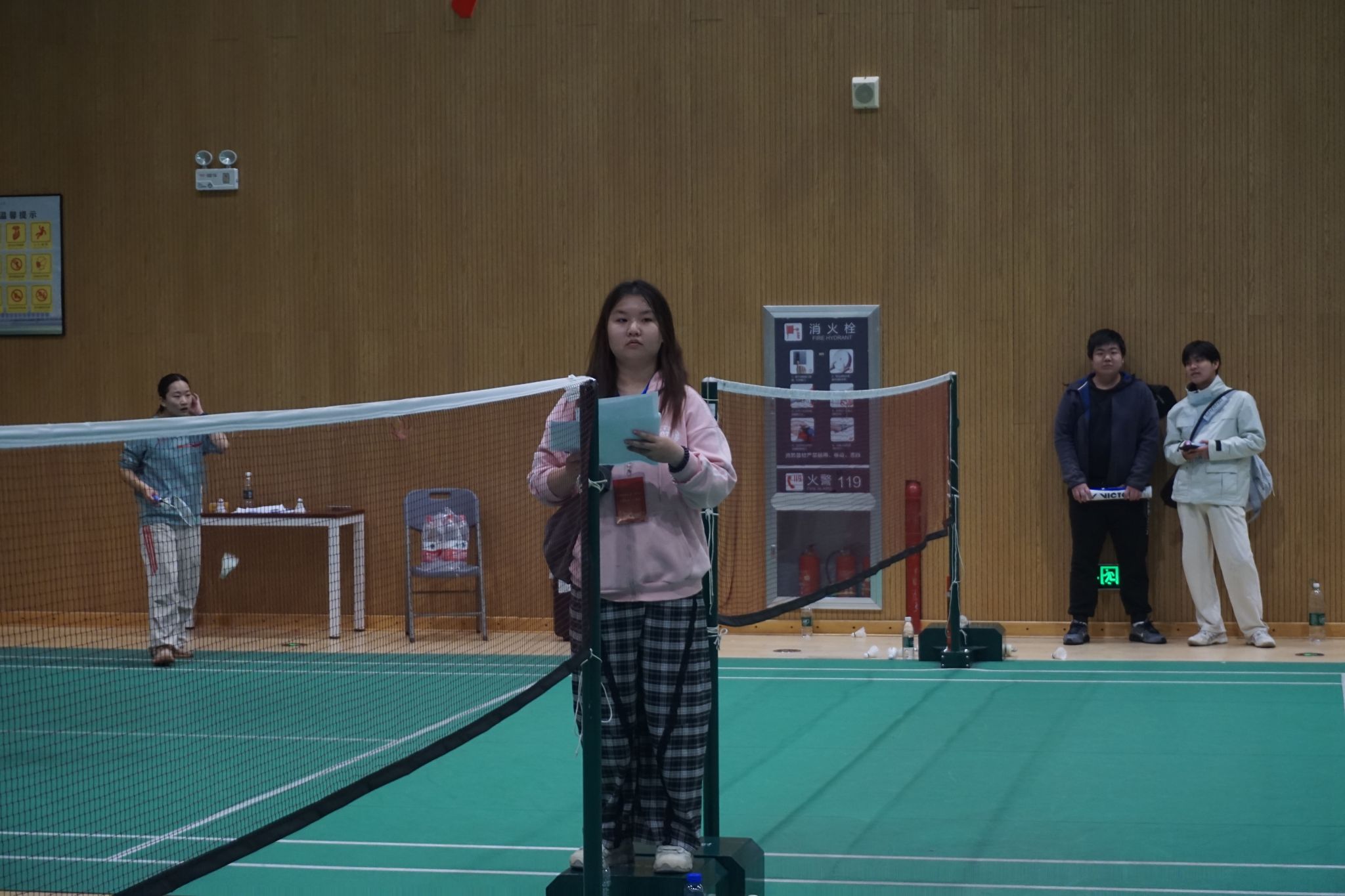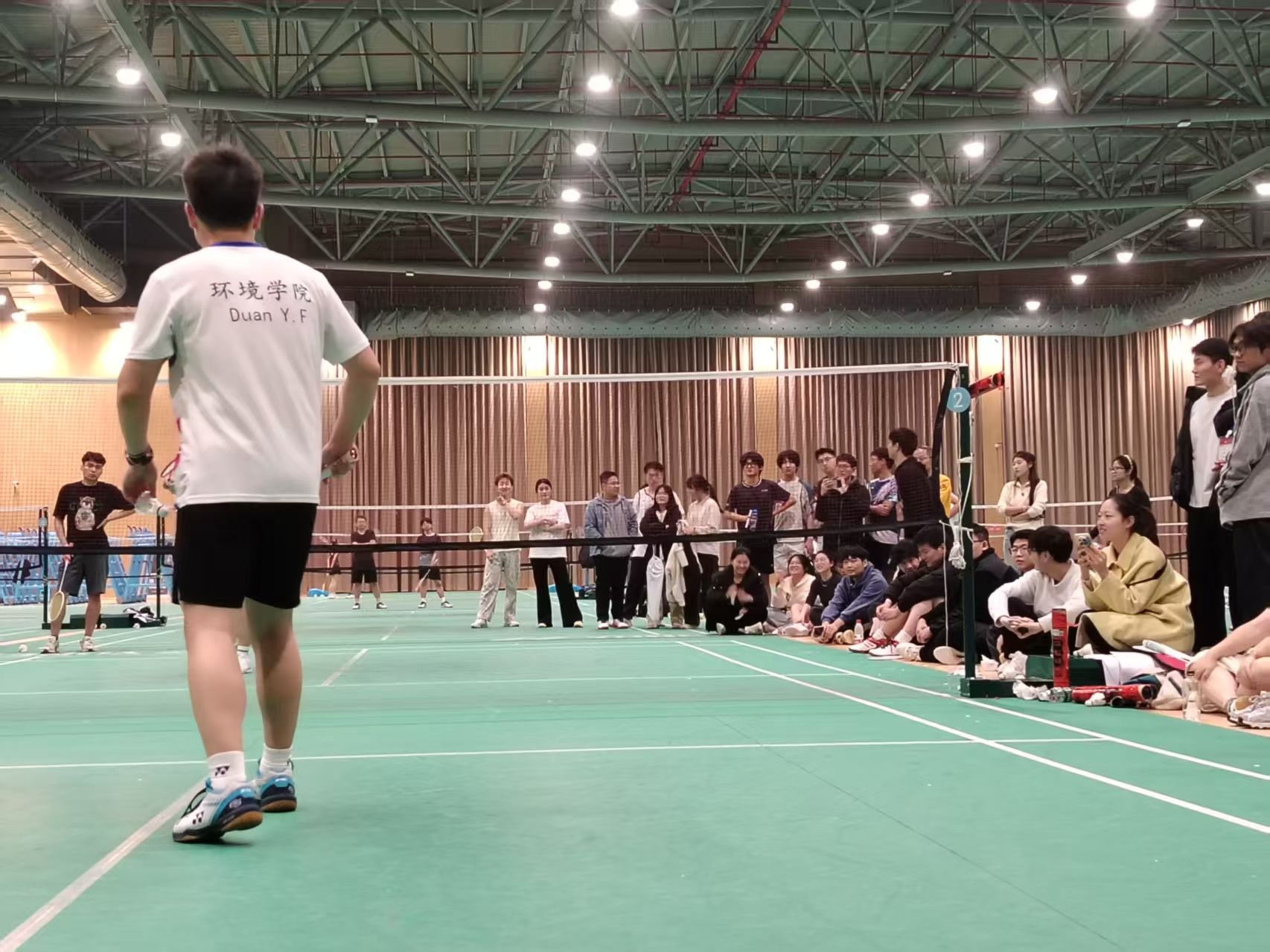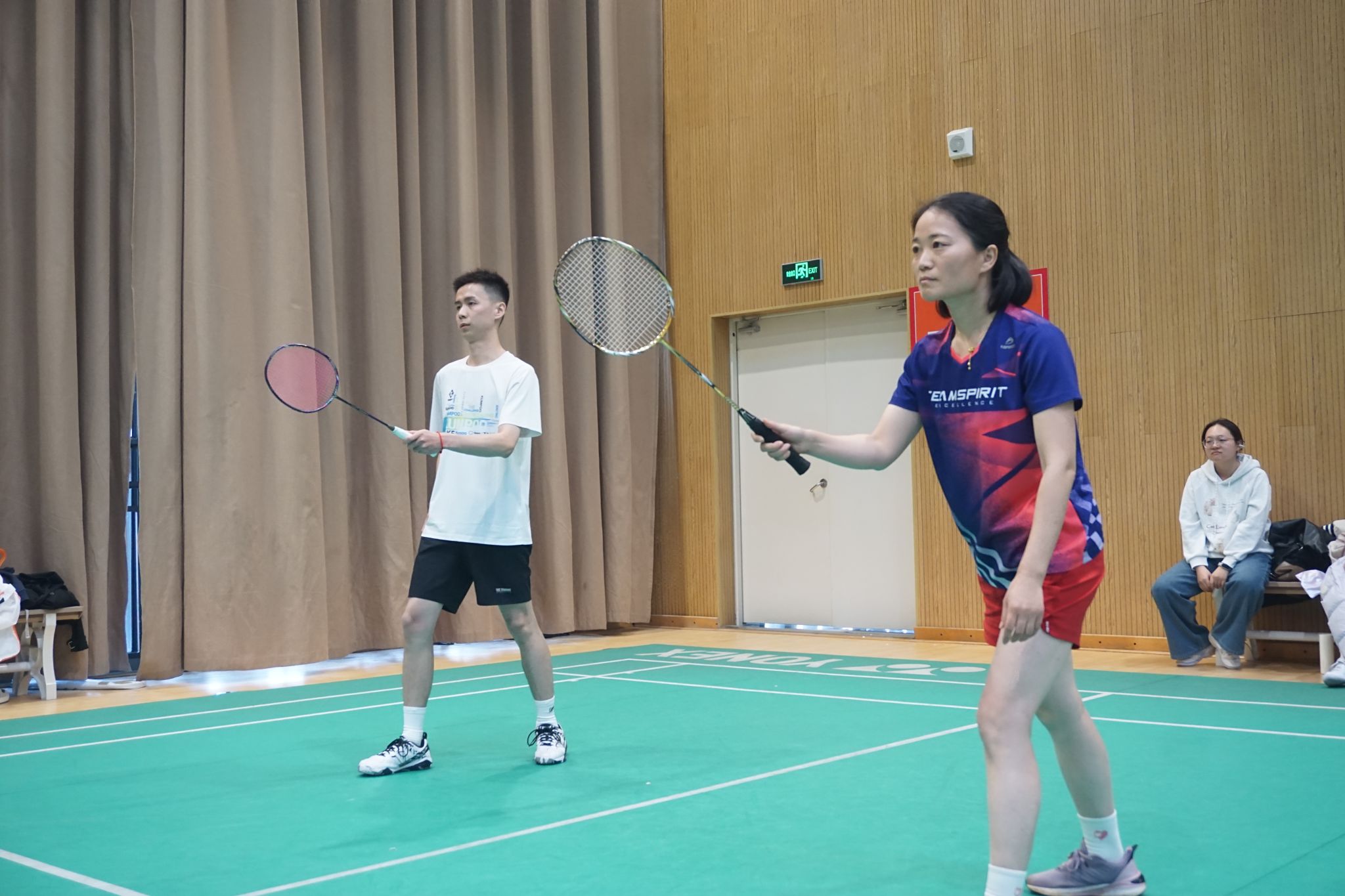 师生齐心,男双精彩对决现场,战术商量,一同准备接球。