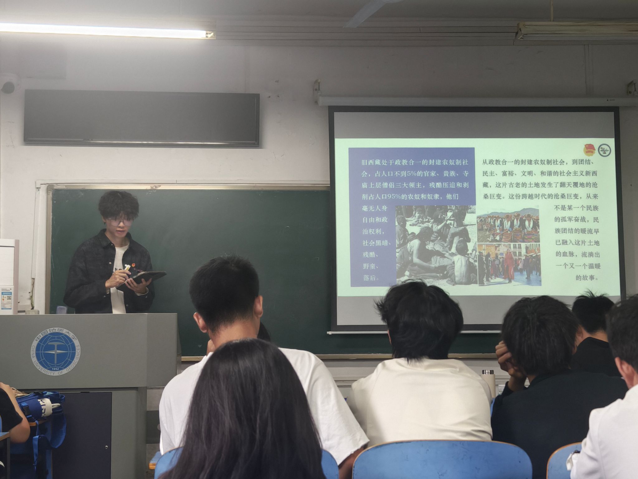 随后,团支部书记何海洋领学“六十年团结发展谱华章,新时代砥砺奋进创辉煌”专题内容。他以西藏自治区成立60周年、新疆维吾尔自治区成立70周年为背景,并以西藏自治区为例介绍了民族共同体的融合和民族进步的成功实践。