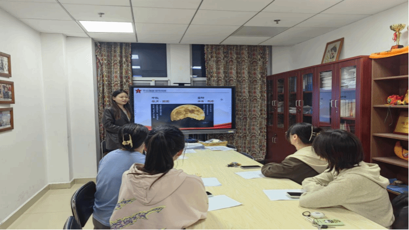 首先,主持人团支部书记马小凡宣布团会开始,随后同学们全体起立,齐唱团歌。活动在庄严的团歌声中拉开帷幕。马小凡首先介绍了本次团日的背景与意义,指出“文化兴国运兴,文化强民族强”,鼓励团员以双节为契机,深入理解团圆敬老、家国一体的文化内核,勇担文化传承与创新的青春责任。从“节日溯源·双节同辉”切入,通过生动的图文与动态时间轴,详细讲解了中秋“祭月·团圆”与重阳“登高·敬老”的文化内涵及非遗习俗,重点介绍了2025年中秋与重阳罕见同聚10月的特殊意义,激发了团员们的浓厚兴趣。